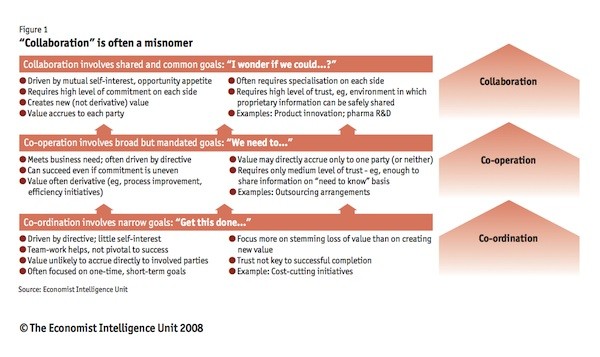 But when my friend from Anecdote, Shawn Callahan, guest posted here recently on “When should we collaborate?”, he talked about the differences between collaboration, co-operation and co-ordination.