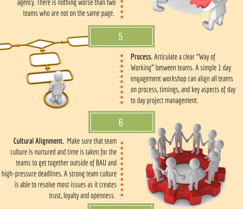 5. Process. Articulate a clear “Way of Working” between teams. A simple 1day engagement workshop can align all teams on process, timings, and key aspects of day-to-day project management.
