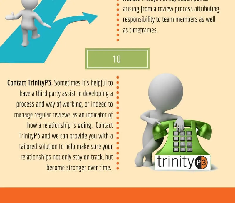 8. Regular Reviews. Establish formal reviews for both teams to survey each other to assess if there are any issues or weak spots that need to be addressed. Importantly, make sure it is qualitative as well as quantitative.