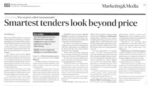 But recently we have seen some amazing claims provided by some agencies during the tender process. Offers of savings that are 20% or 30% better than some of the best discounts in the market. And clearly this happens on pitches we are not involved in. AdNews reported in October 2013 that an agency offered a discount on television rates of 92%. Even the media owners said this was undeliverable, but still in the race for lower media and marketing costs, the agencies playing this game are winning.